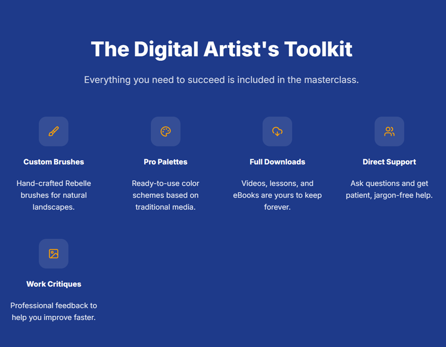 One-time payment. Lifetime access. 20 lessons + Live Webinar + Artist's Toolkit.